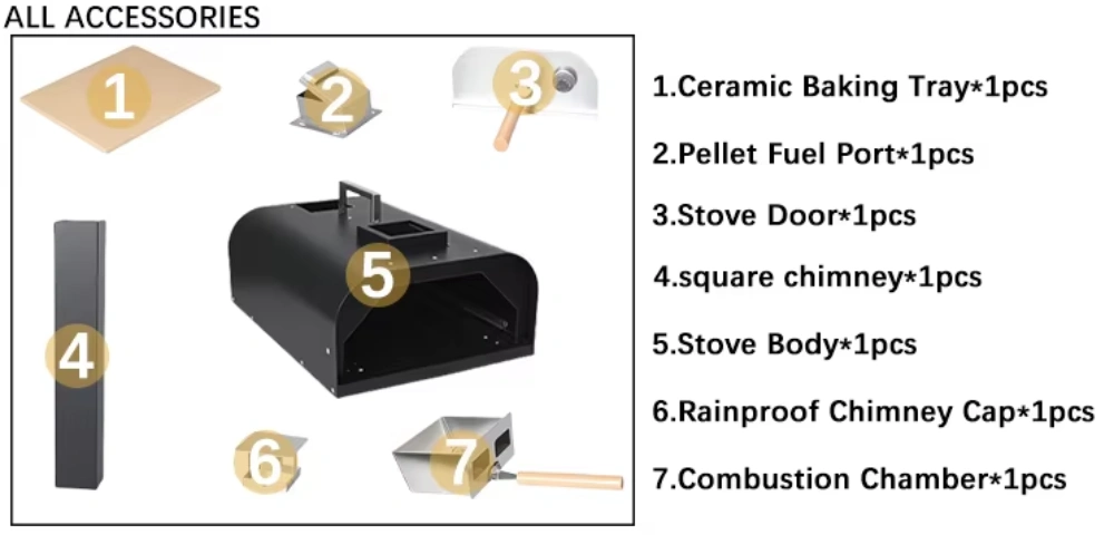 8. Juego completo de accesorios incluido: espátula para pizza estándar, tubo de escape, losa de piedra, etc., listos para usar al abrir, no se requieren compras adicionales.